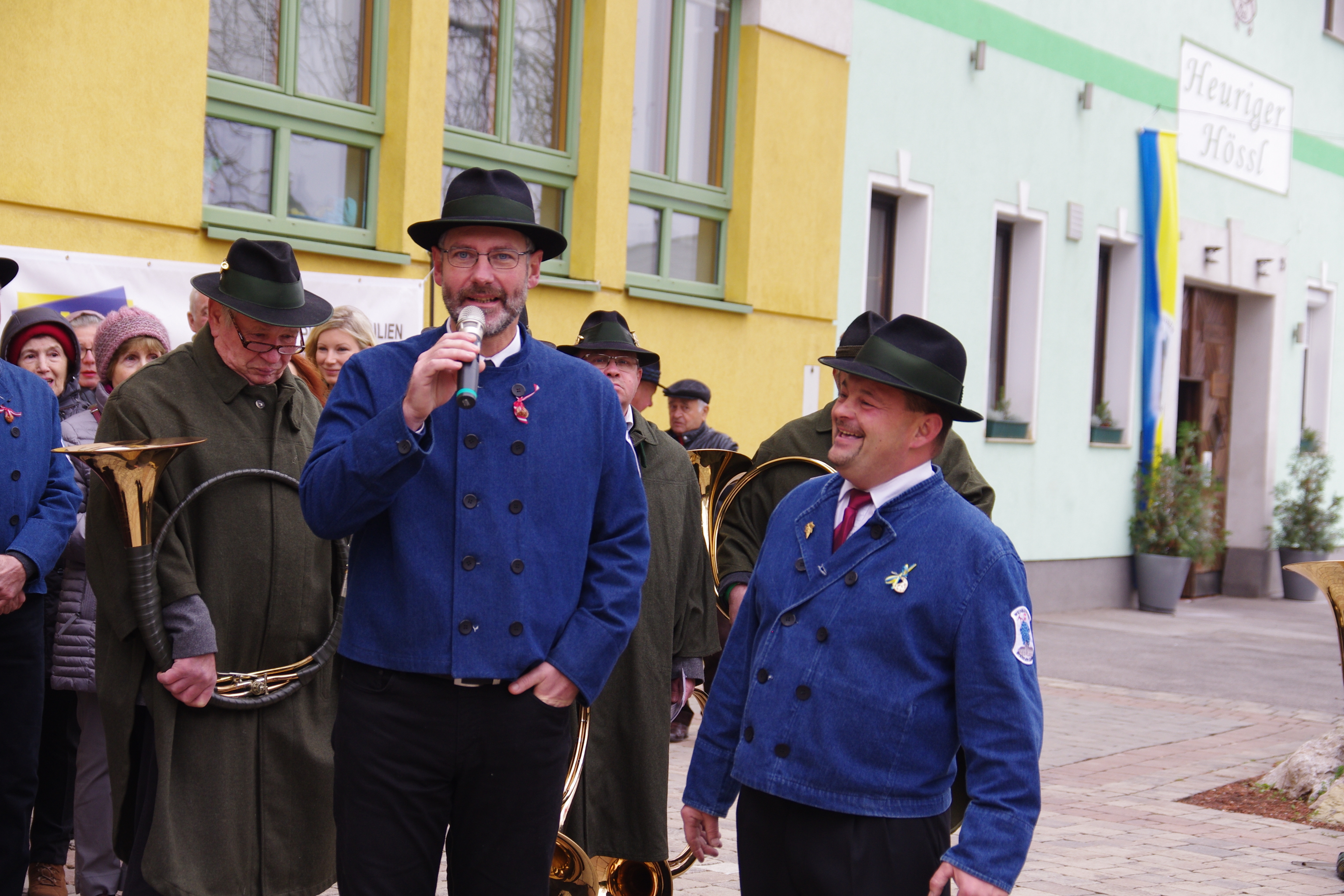 Nach der Messfeier zogen die zahlreichen Gäste bei eisigem Wind, angeführt von der Trachtenmusik um den Brunner Spitz bis vor den Heurigen von Familie Hössl, wo die Festansprachen und auch die Weinsegnung stattfanden. Mit köstlicher Ganslsuppe, Speck- und Olivenstangerln und selbstverständlich dem Staubigen wurde weitergefeiert.